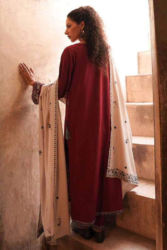 GARNET - 3PC KHADDAR EMBROIDERED SHIRT WITH TWILL PRINTED SHAWL AND TROUSER - HZU2505