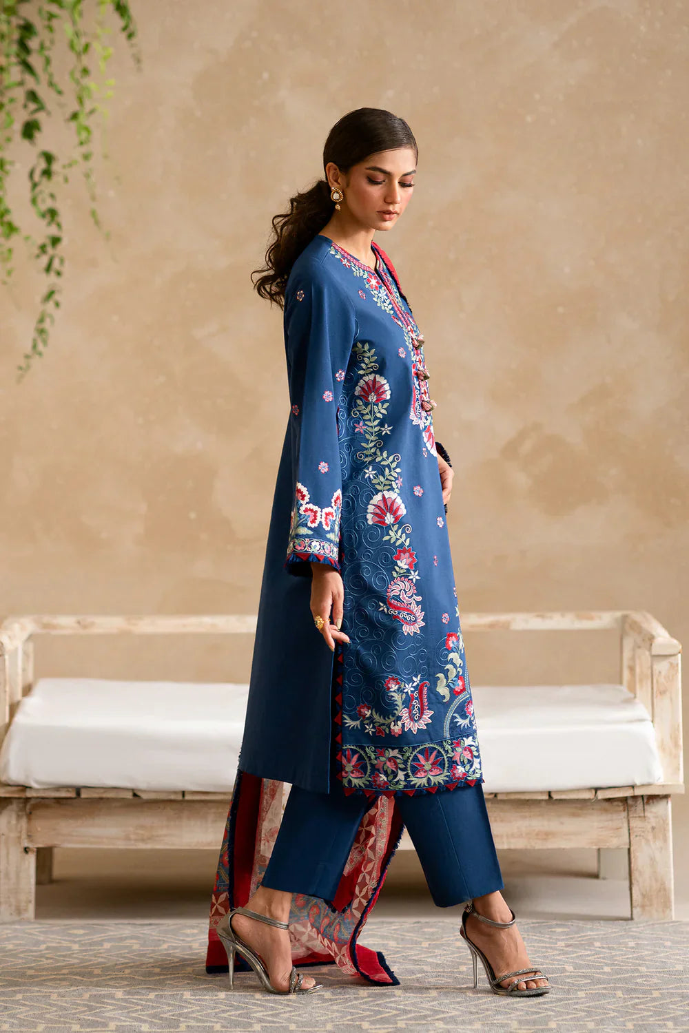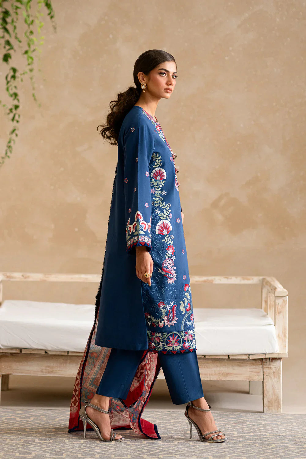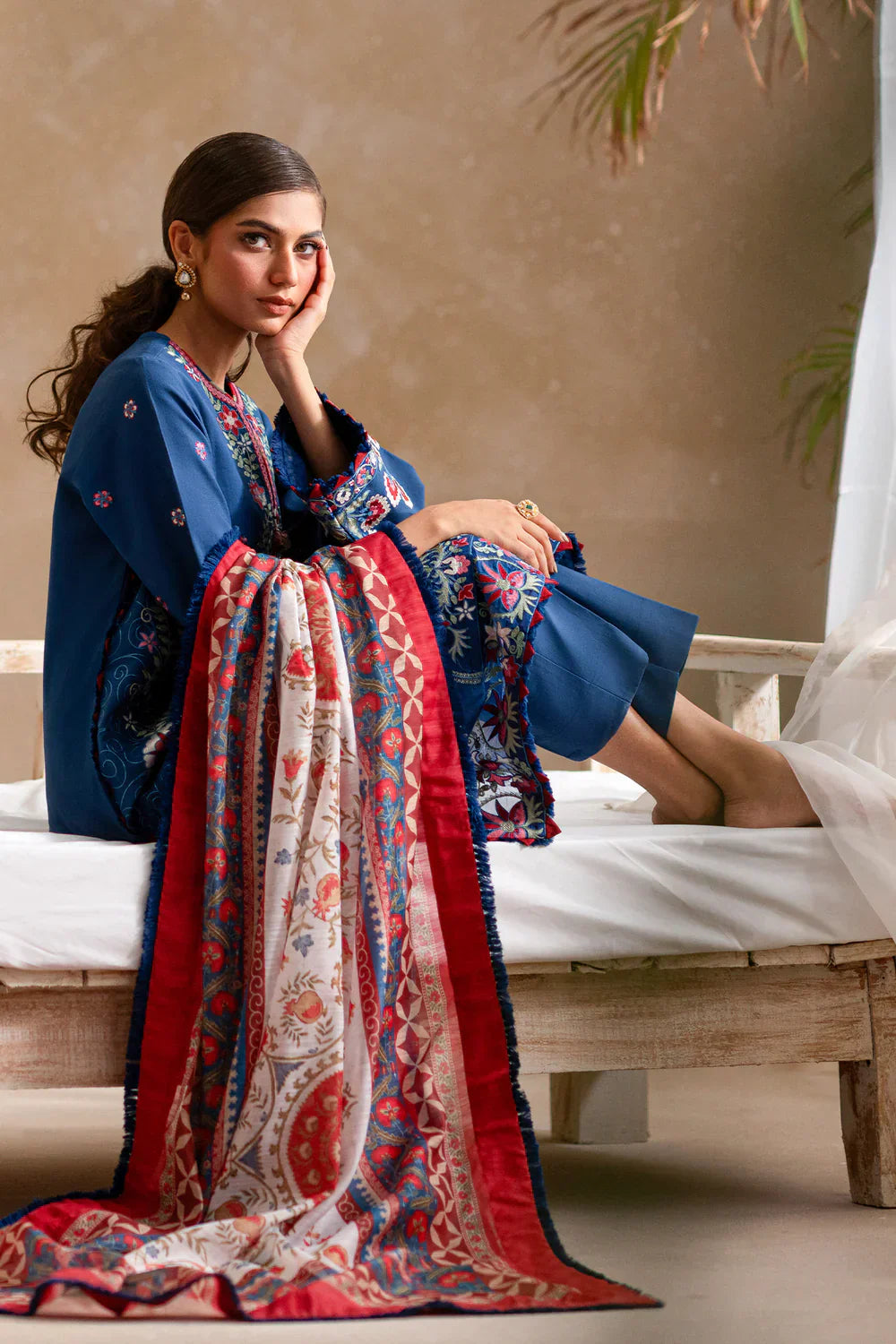 ETHNC - 3PC DHANAK EMBROIDERED SHIRT WITH TWILL PRINTED SHAWL AND TROUSER - HZG2396