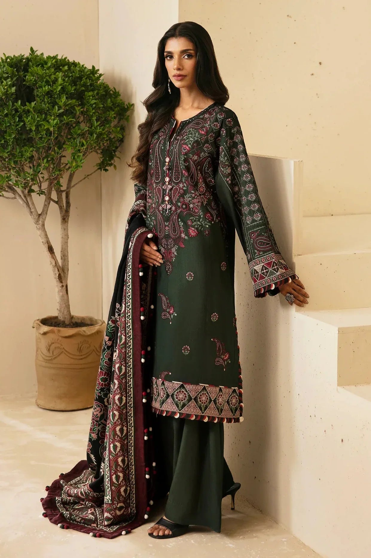ETHNIC - 3PC DHANAK EMBROIDERED SHIRT WITH TWILL PRINTED SHAWL AND TROUSER - HZG1932