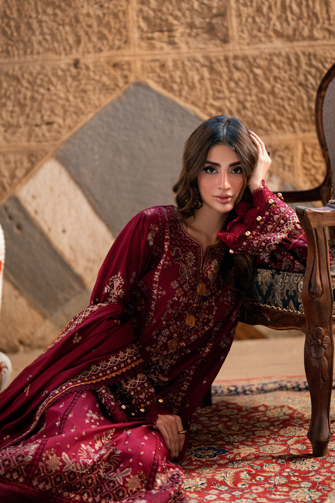 FLORENT - 3PC DHANAK EMBROIDERED SHIRT WITH DHANAK EMBROIDERED SHAWL AND TROUSER - HZG2601