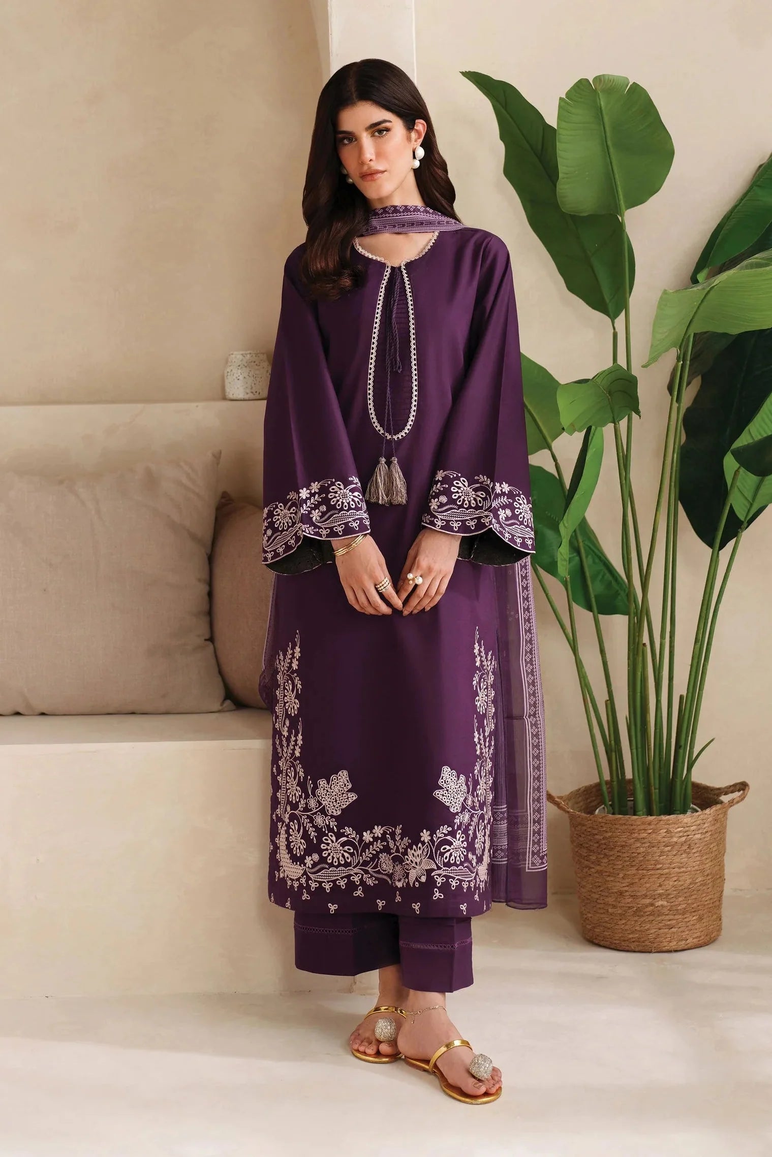 GARNET - 3PC DHANAK EMBROIDERED SHIRT WITH TWILL PRINTED SHAWL AND TROUSER - HZU2479