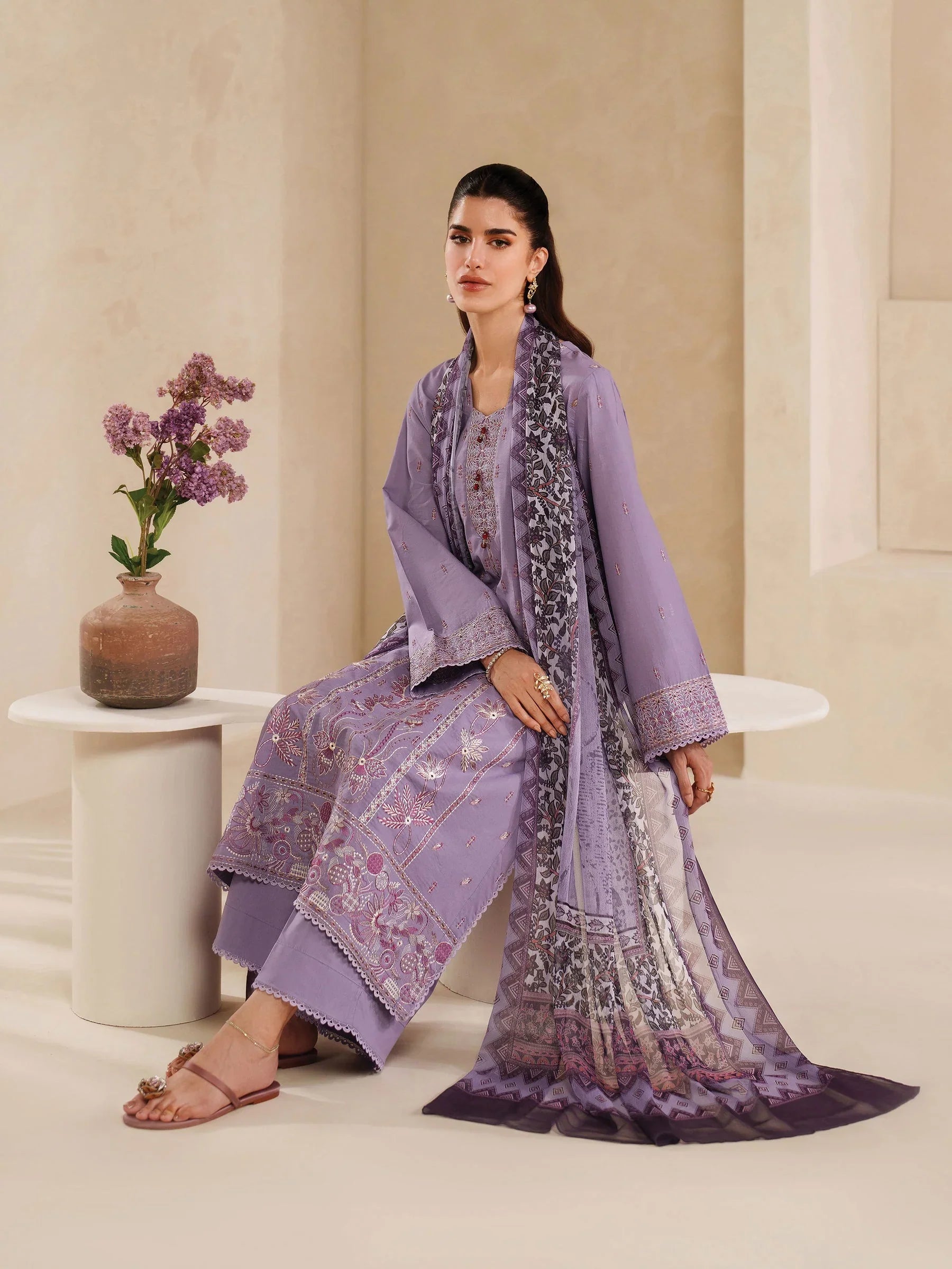 GARNET - 3PC DHANAK EMBROIDERED SHIRT WITH TWILL PRINTED SHAWL AND TROUSER - HZU2483