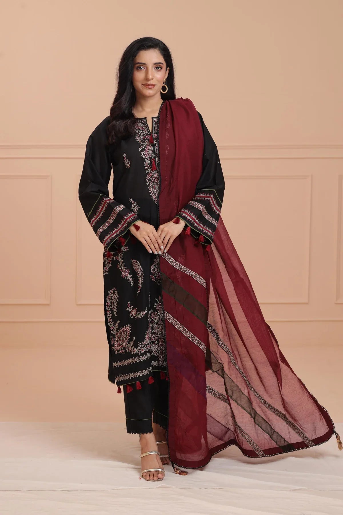 JAZMIN - 3PC DHANAK EMBROIDERED SHIRT WITH MANAAR PRINTED DUPATTA AND TROUSER - HZG2452