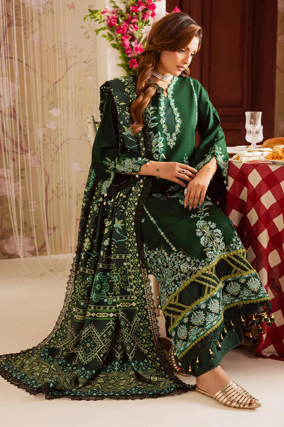 MAHNUR - 3PC DHANAK EMBROIDERED SHIRT WITH TWILL PRINTED SHAWL AND TROUSER - HZU2531