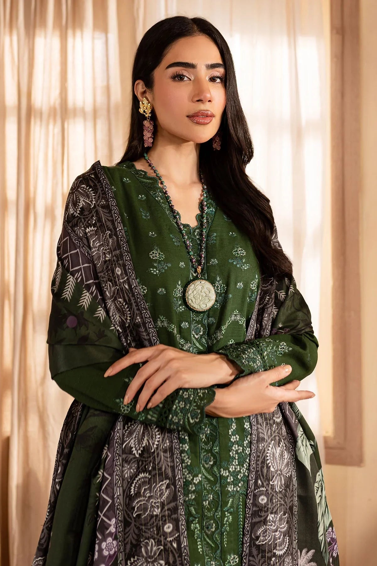 NUREH - 3PC DHANAK EMBROIDERED SHIRT WITH TWILL PRINTED SHAWL AND TROUSER - HZU2538
