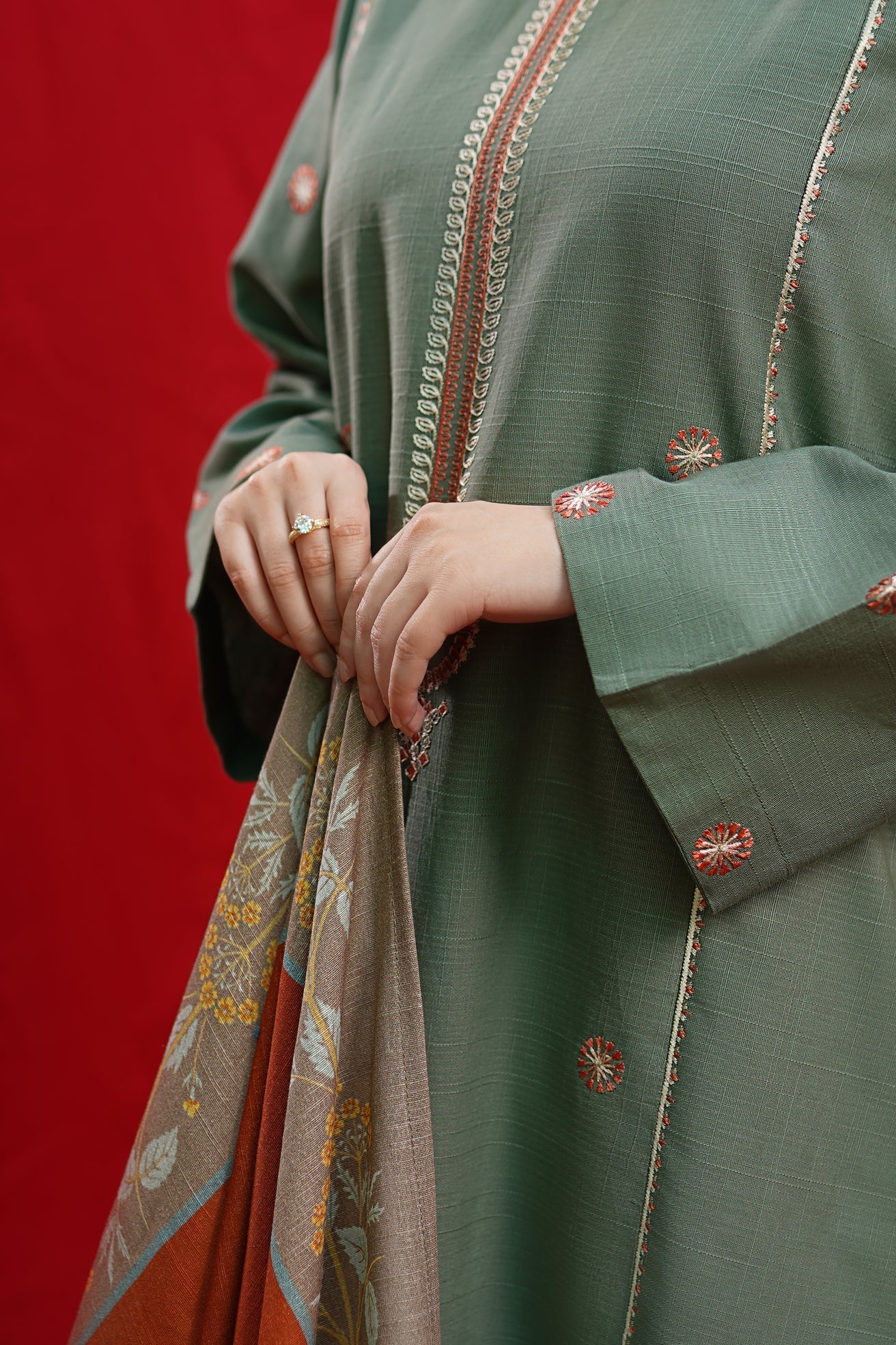 URGE - 3PC DHANAK EMBROIDERED SHIRT WITH TWILL PRINTED SHAWL AND TROUSER - HZG1954