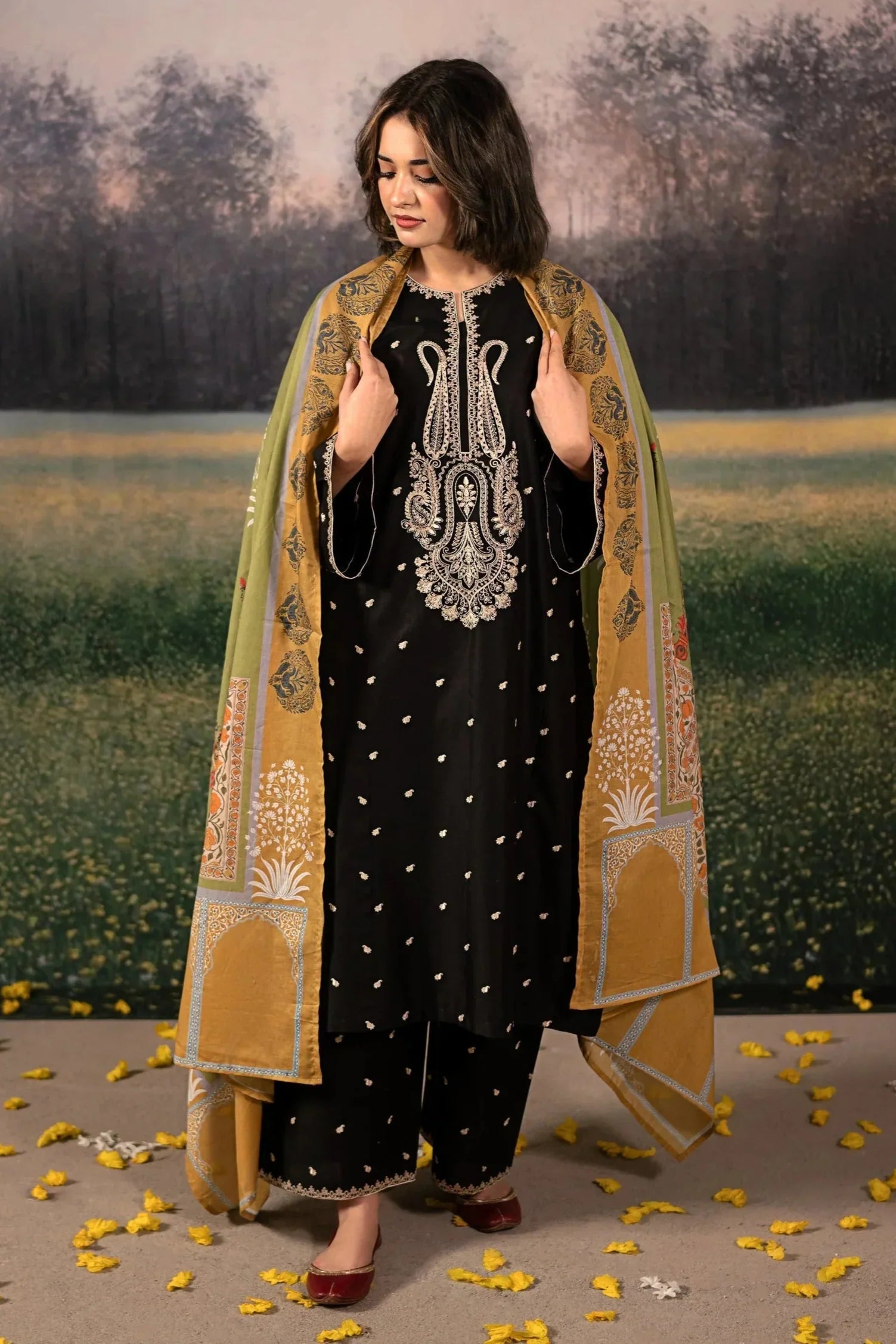 URGE - 3PC DHANAK EMBROIDERED SHIRT WITH TWILL PRINTED SHAWL AND TROUSER - HZG2371