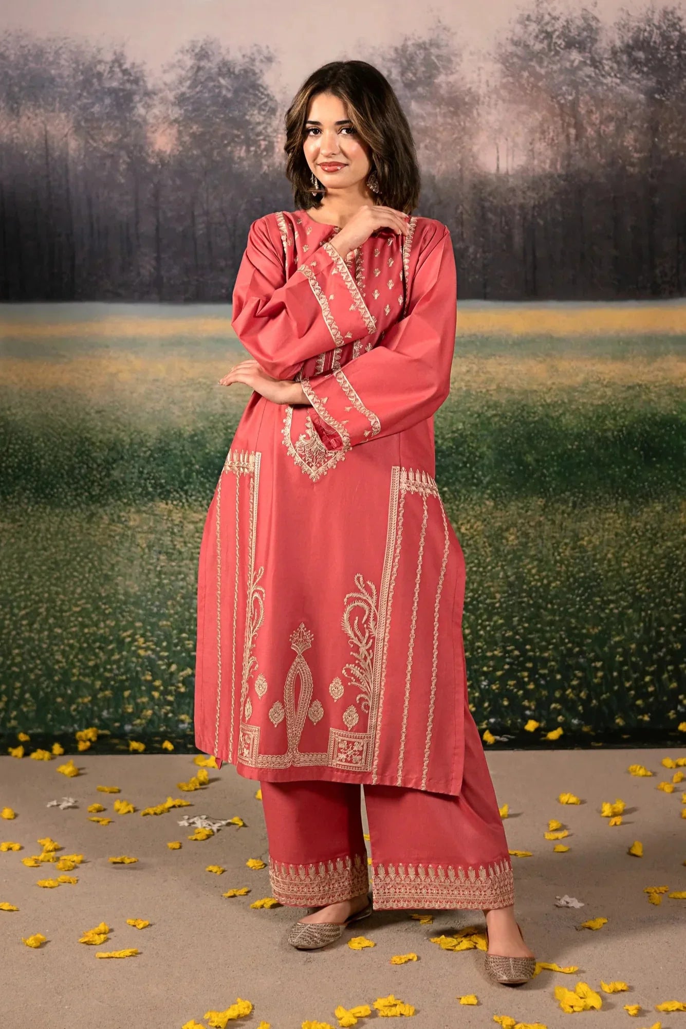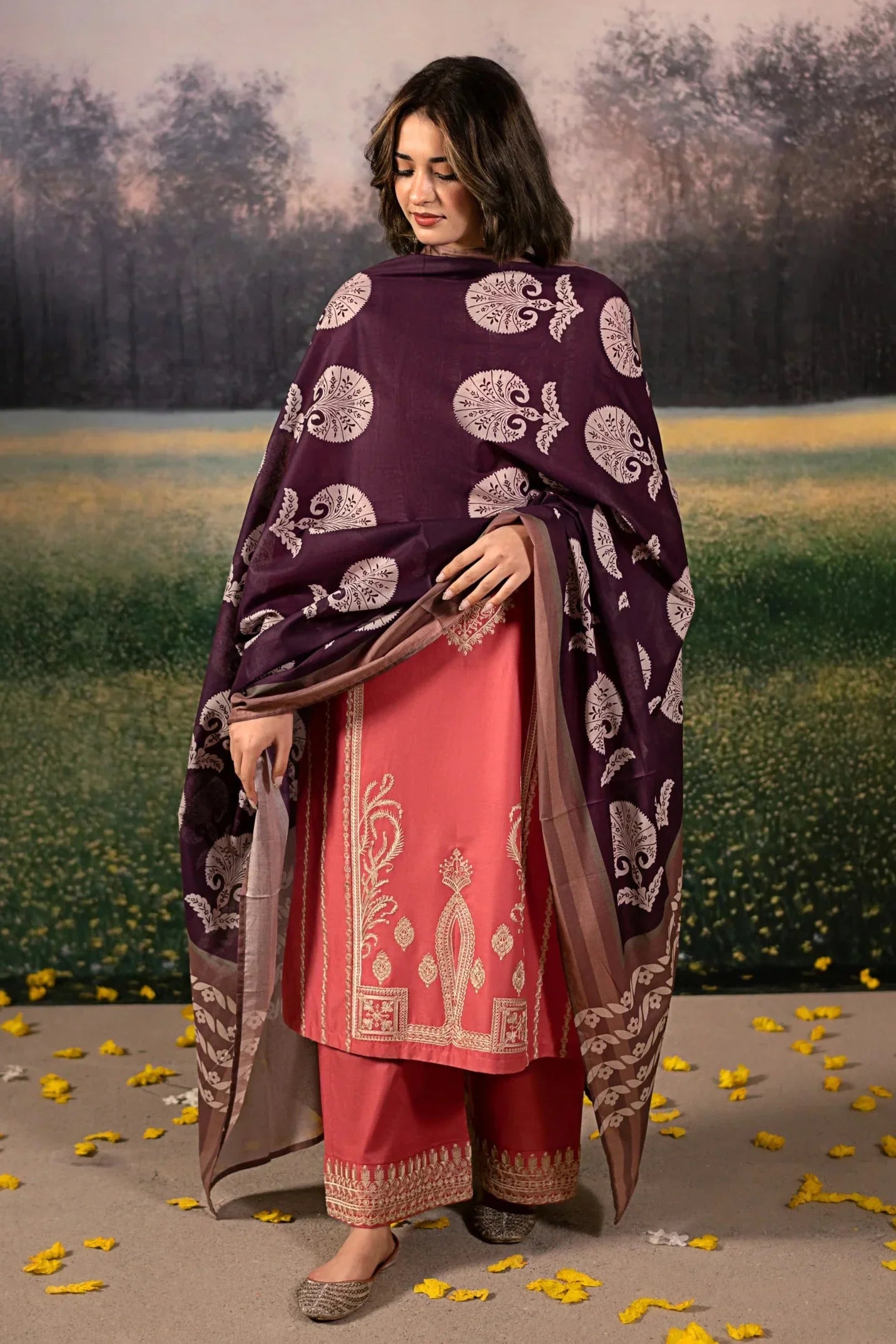 URGE - 3PC DHANAK EMBROIDERED SHIRT WITH TWILL PRINTED SHAWL AND TROUSER - HZG2389