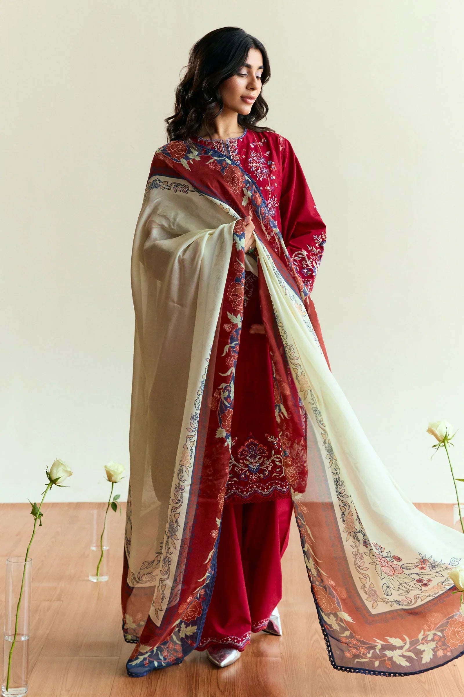ZARA SHAH JAHAN - 3PC DHANAK EMBROIDERED SHIRT WITH TWILL PRINTED SHAWL AND TROUSER - HZG2339