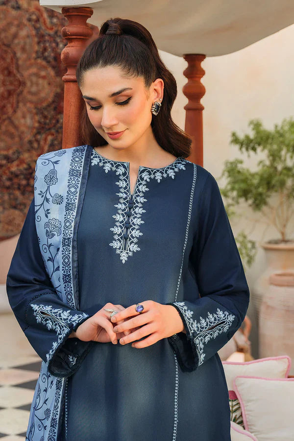 ZIVA - 3PC DHANAK EMBROIDERED SHIRT WITH TWILL PRINTED SHAWL AND TROUSER - HZG1542